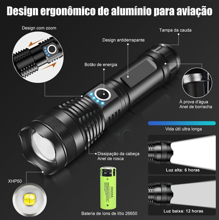 ✔ Corpo em alumínio reforçado, resistente à agua e impactos